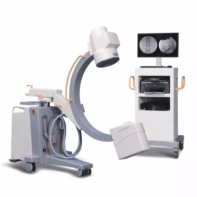 A High Frequency (Mobile) C-Arm X-Ray Machine is an advanced radiographic imaging system that is designed for real-time imaging during surgical procedures, interventional radiology, and orthopedic procedures. The machine features a C-shaped arm, which houses both the X-ray tube and the image intensifier or flat-panel detector, allowing for continuous imaging during operations or diagnostics.