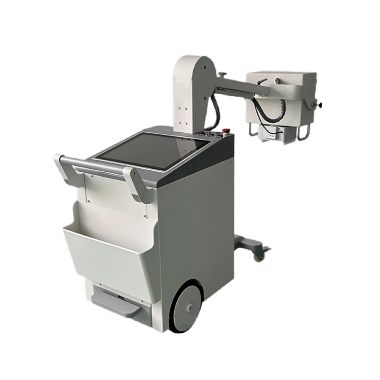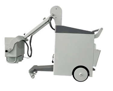 The mobile X-ray machine is designed to be easy to transport and maneuver. It is mounted on wheels for smooth movement across various terrains, which is ideal for emergency settings or places where mobility is crucial.