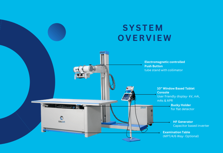 The 500mA Edusoft X-Ray Machine is a digital radiography system designed for high-quality medical imaging, using 500 milliamps (mA) as its maximum current to produce X-rays. "Edusoft" typically refers to the proprietary software suite that accompanies the machine, offering advanced image processing and management tools. These systems are known for delivering clear, detailed images with enhanced workflow and minimal radiation exposure, often integrated with modern digital detectors like flat-panel detectors (FPD) or CCDs (charge-coupled devices).