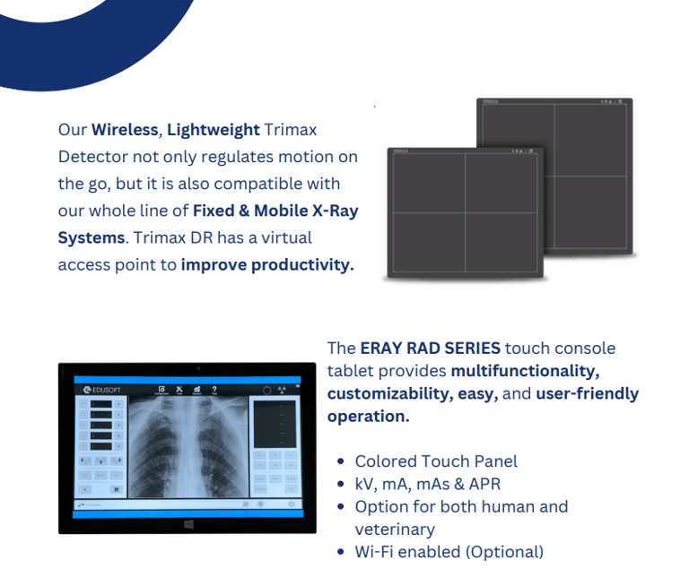 The Edusoft X-ray system is designed to be user-friendly with an intuitive interface. It offers both wireless and wired options, allowing for flexible use across a variety of clinical environments.