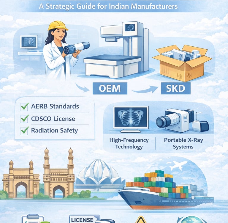 Learn how OEM and SKD export models work in the X-ray industry. Complete guide covering CDSCO, AERB compliance, QA standards, and global market strategy for Indian manufacturers.