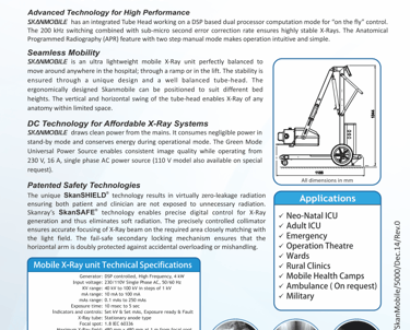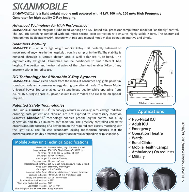 The Skanmobile is designed to be easily moved around, making it perfect for emergency care, ICUs, and fieldwork. It offers mobile diagnostics in places where traditional X-ray machines may be impractical.